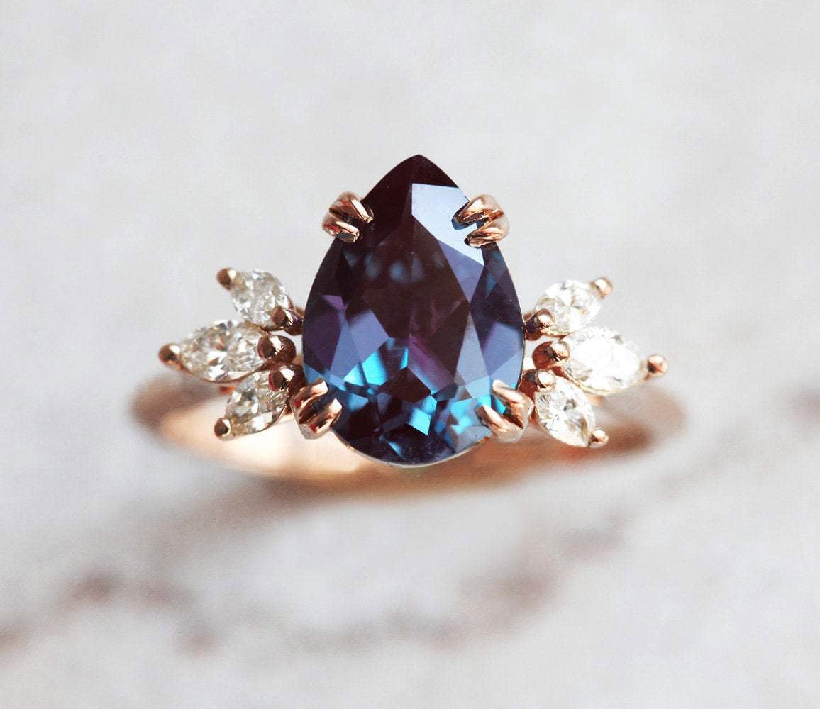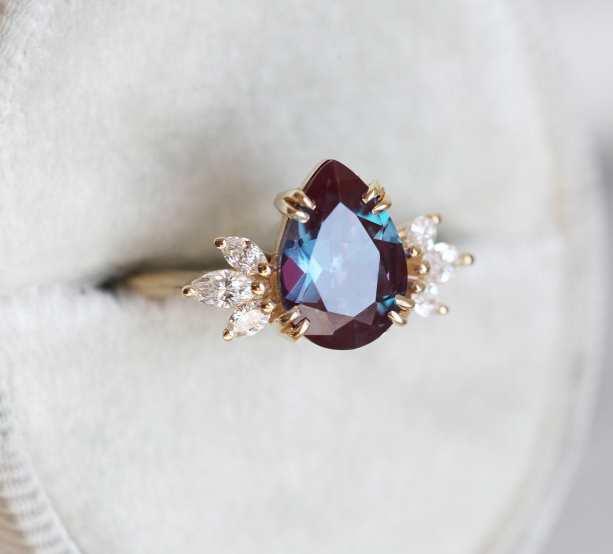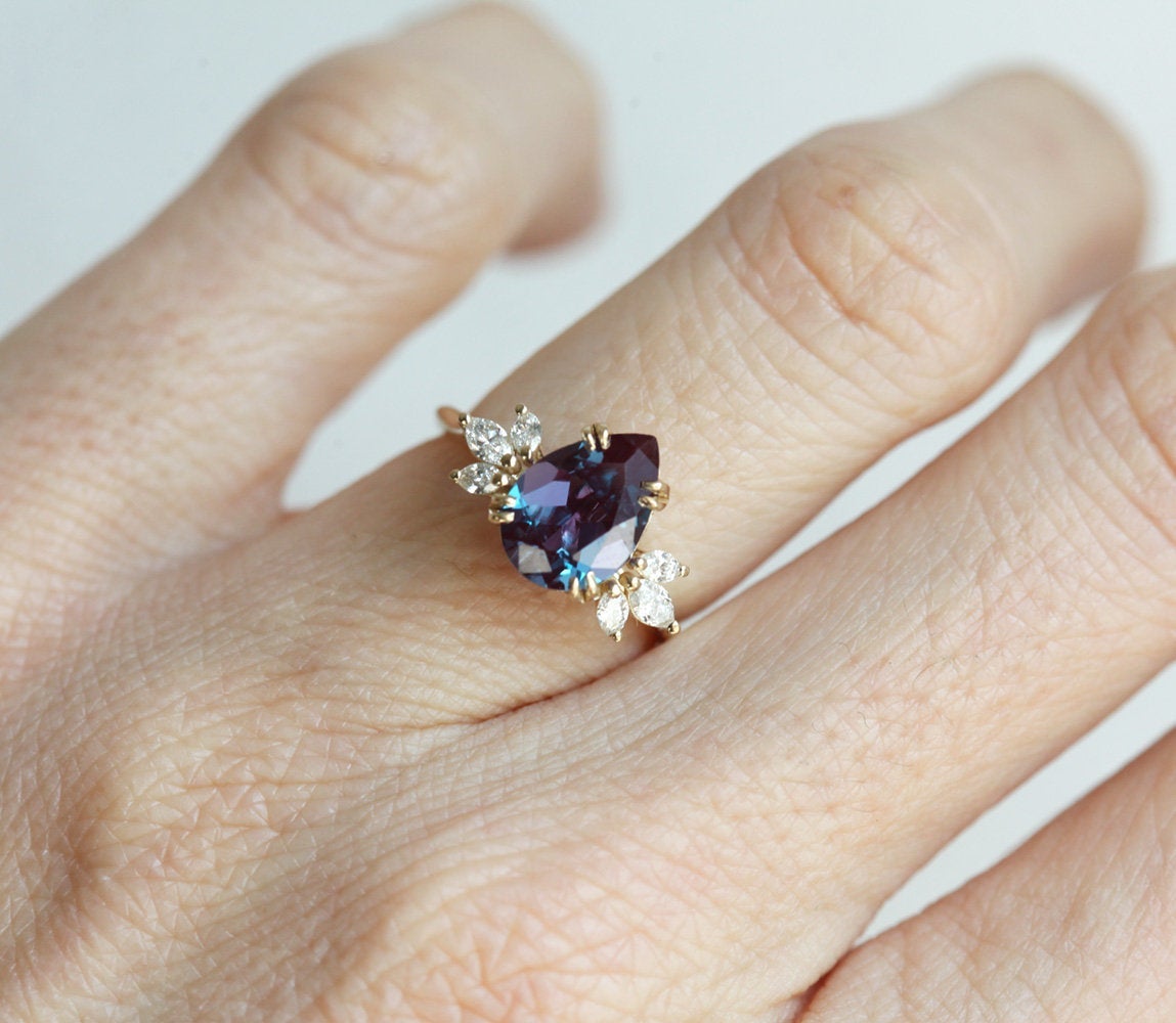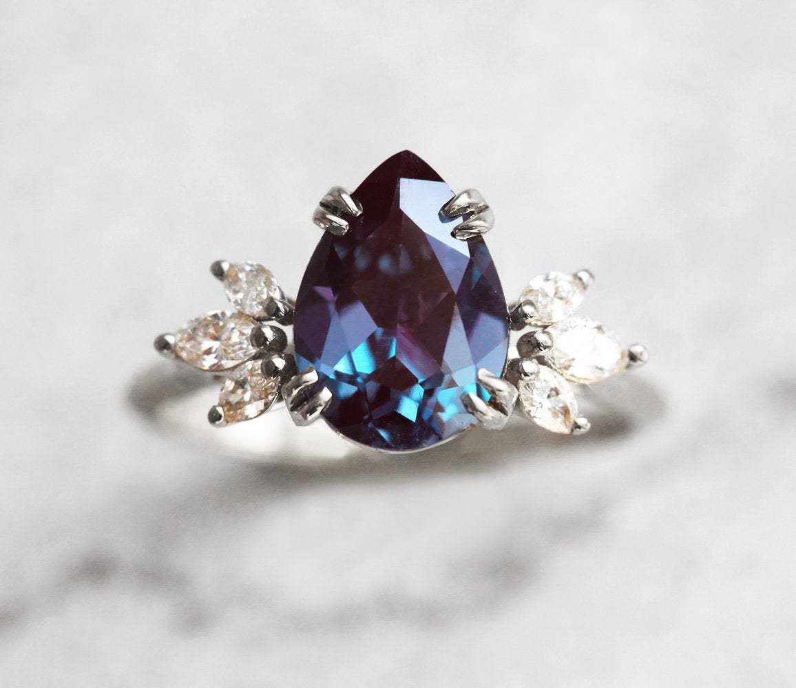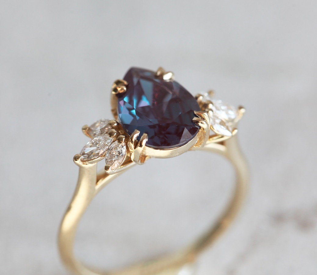 Teal Pear Lab Alexandrite Ring with 6 Side Marquise-Cut White Diamonds
