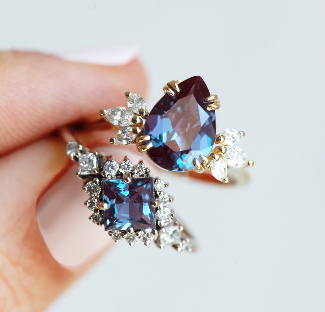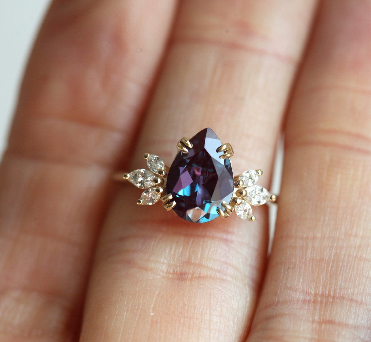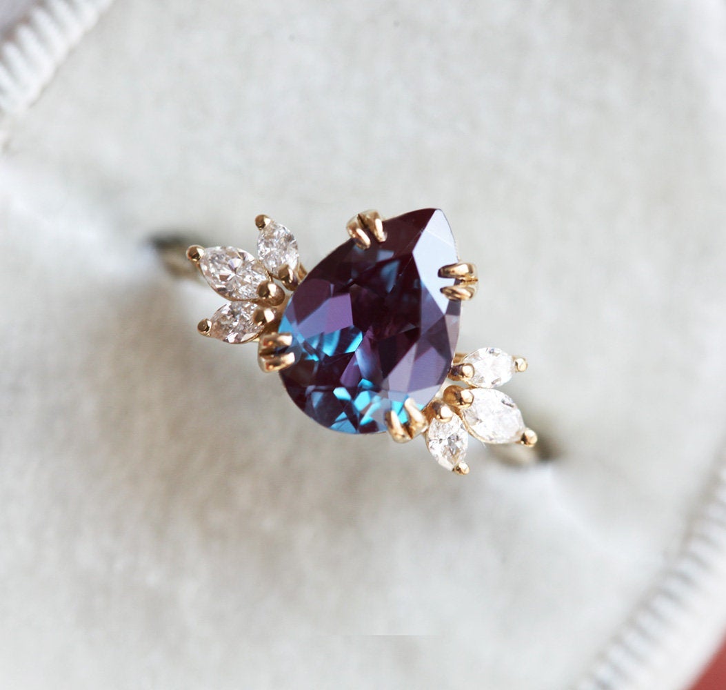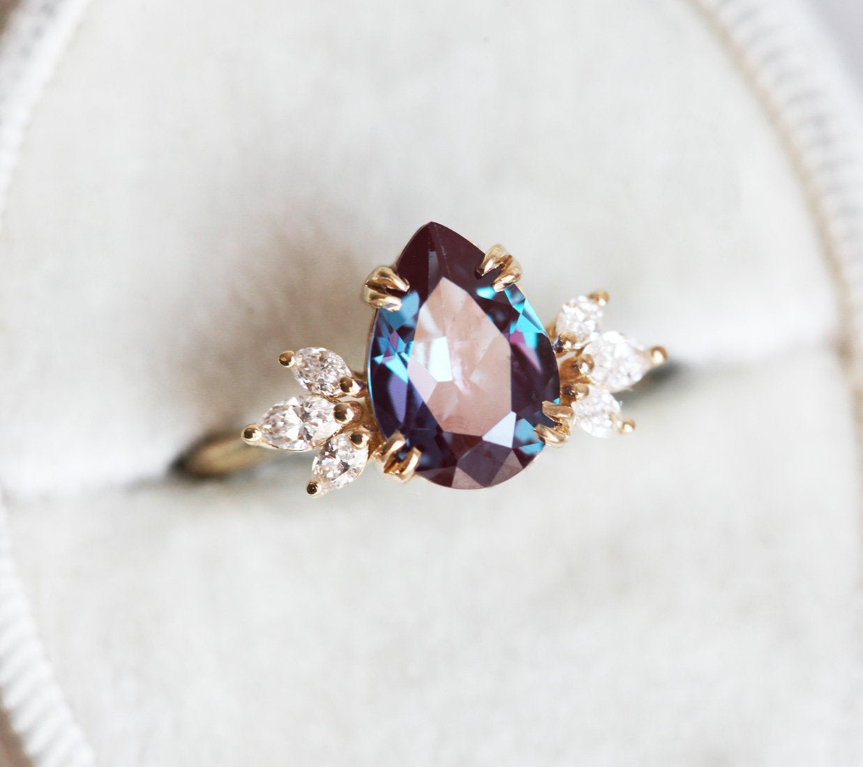 Teal Pear Lab Alexandrite Ring with 6 Side Marquise-Cut White Diamonds