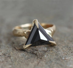 Lilith, a triangle-cut black diamond ring with a raw-looking, hammered yellow gold band. This ring was handcrafted and the exact shape of the bands may vary upon order, making it a one-of-a-kind type of jewelry.