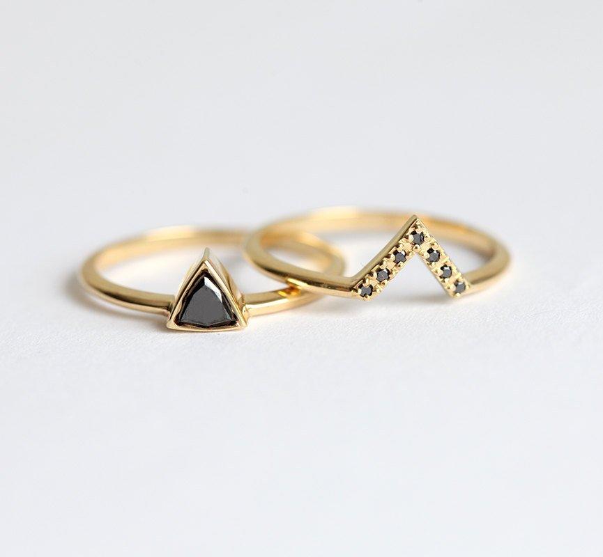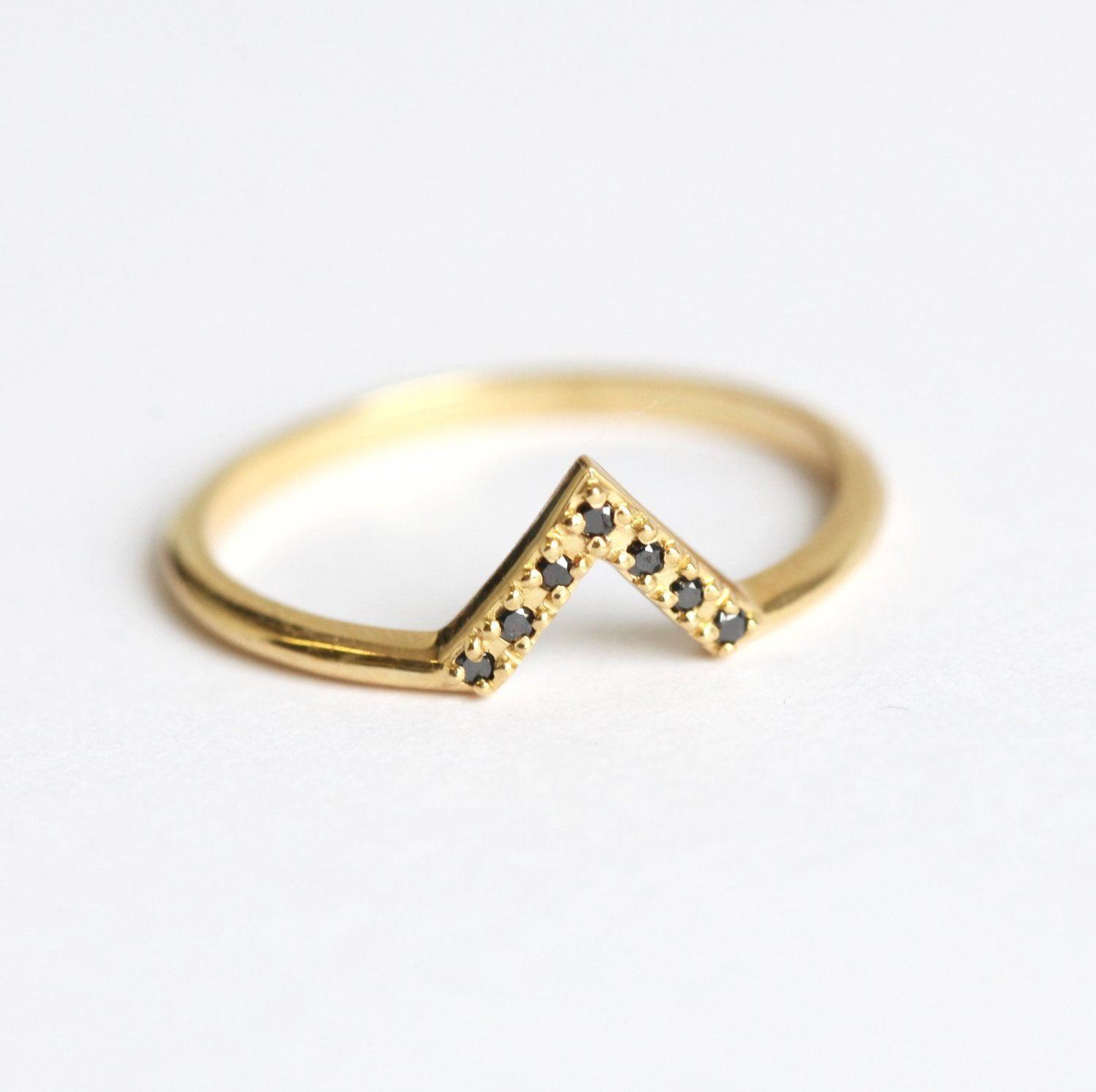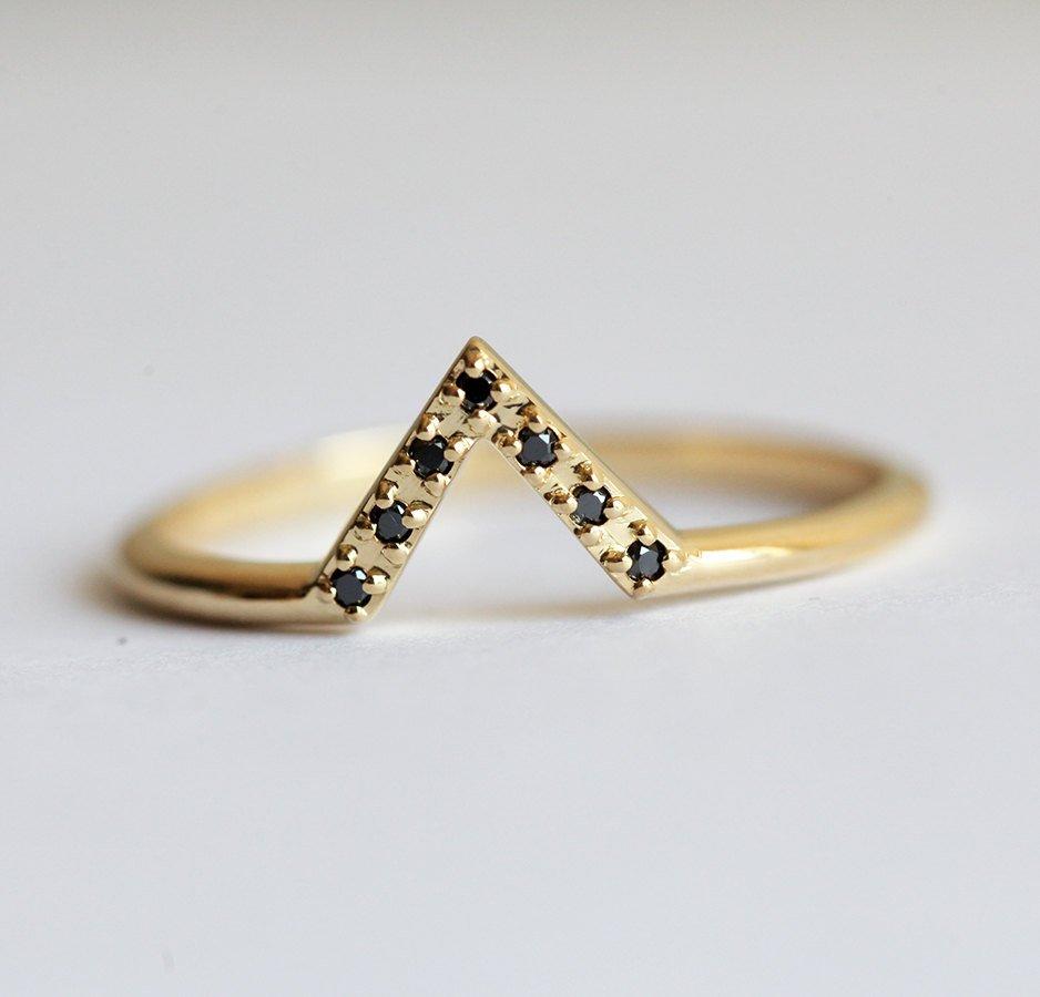 ELEGANT BLACK DIAMOND CHEVRON GOLD RING WITH PRONG SETTING