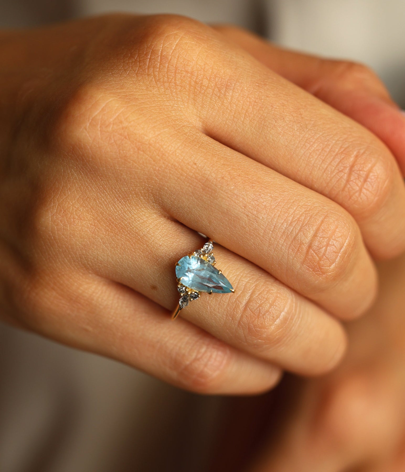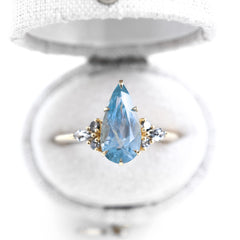 Pear-cut pastel blue sapphire ring with accent salt and pepper diamonds.
