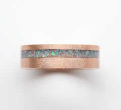 Unisex opal inlay wedding band ring. Modern ring with crushed Australian opal for him or her, pictured in rose gold with a satin finish.
