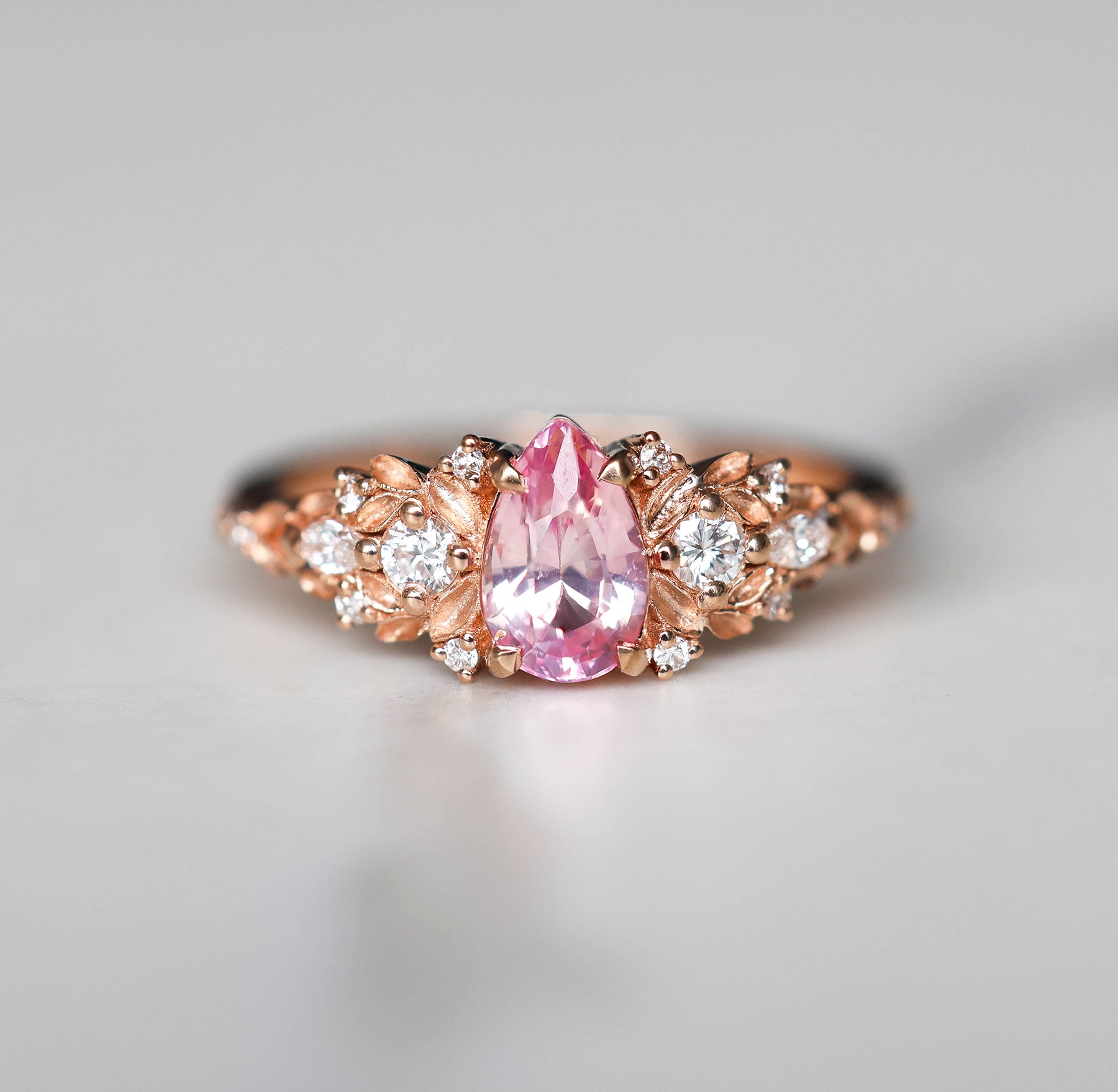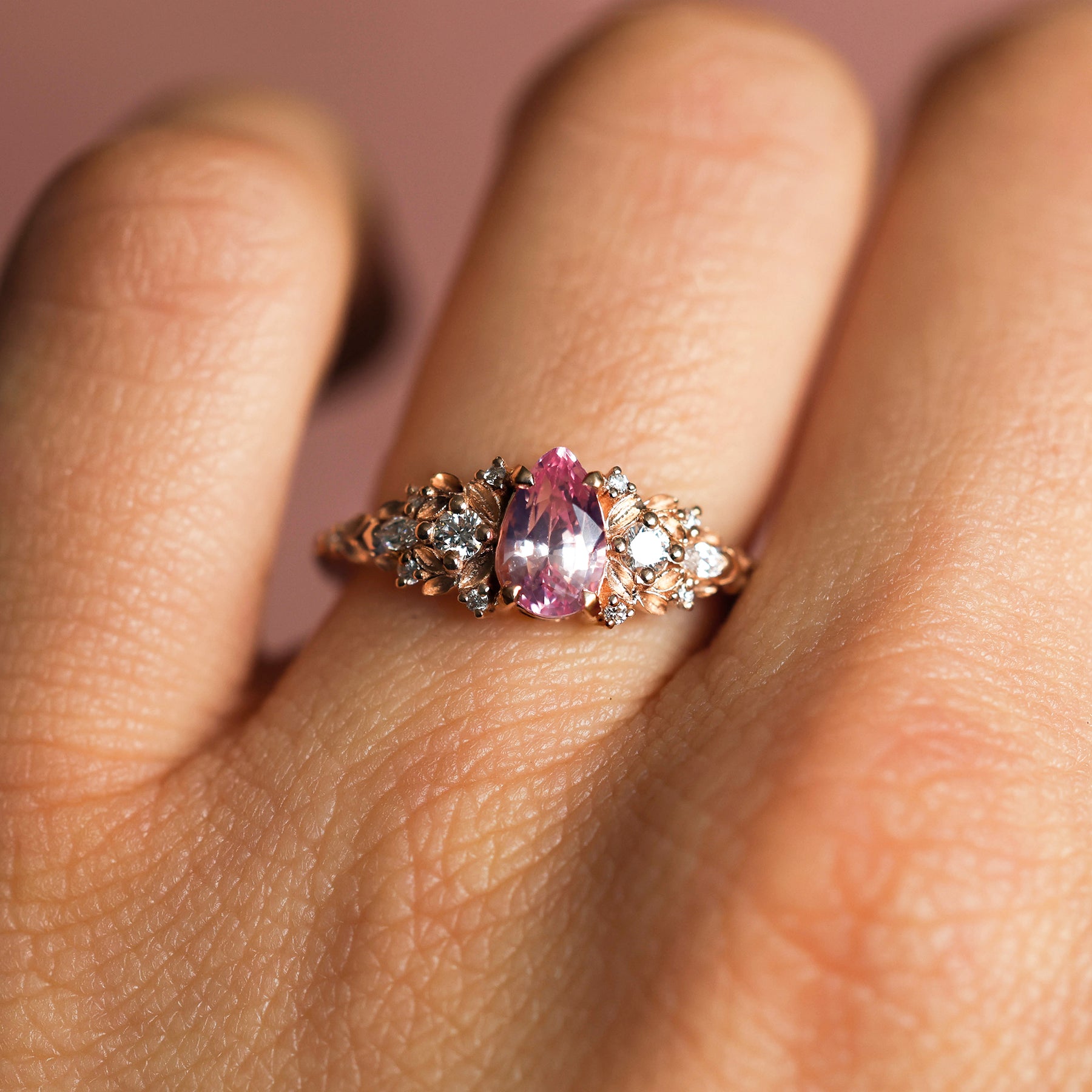 Unique Sapphire engagement ring, pictured here with a 1.12ct padparadscha sapphire and accent diamonds framed by leaves. Available with other gemstones, select from drop down menu.