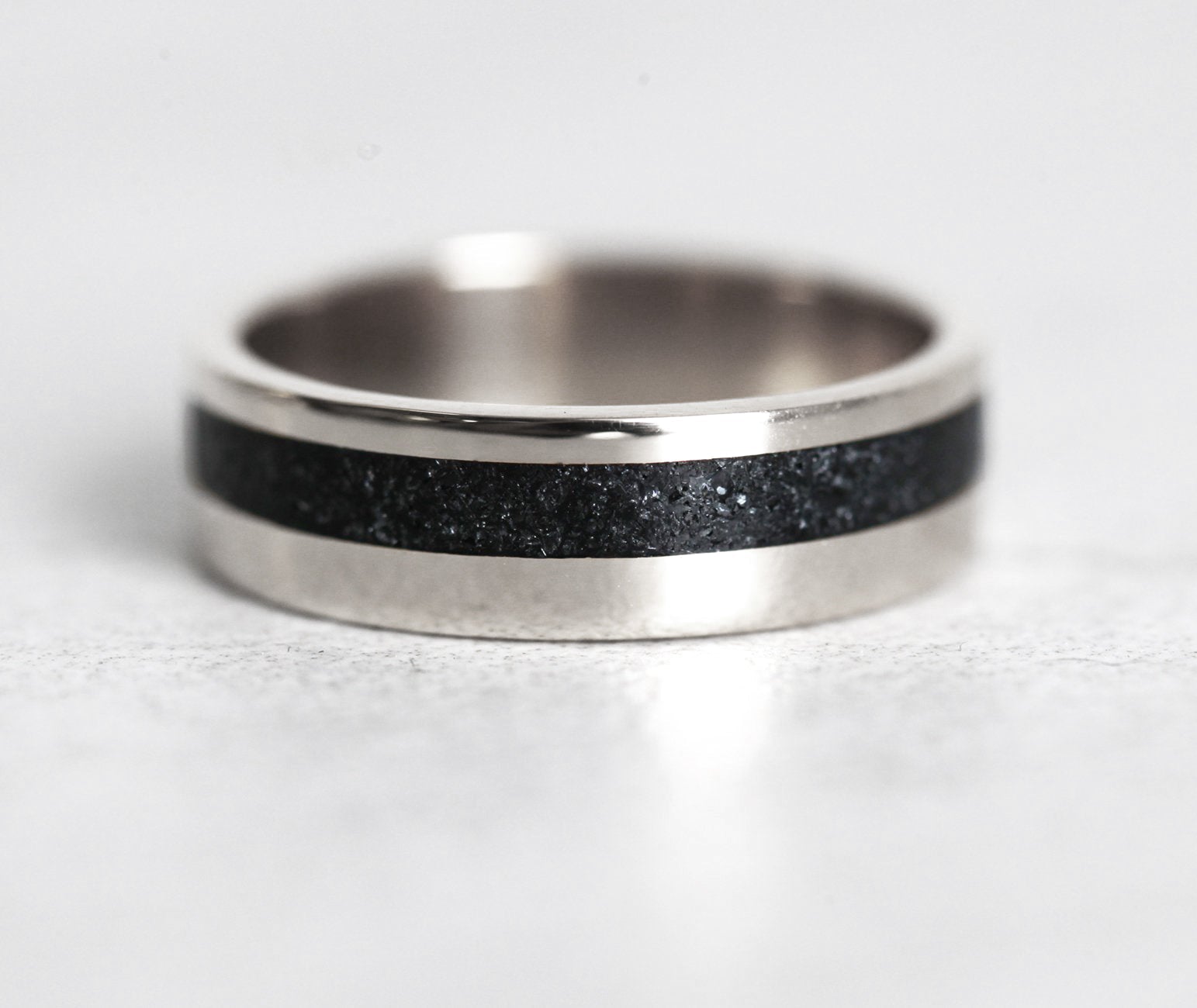 This elegant design is a men's inlay black spinel ring in gold or platinum. It s perfect as a simple wedding band or promise band for him. Compliment it with one of our beautiful Black Diamond rings for her for a matching set.