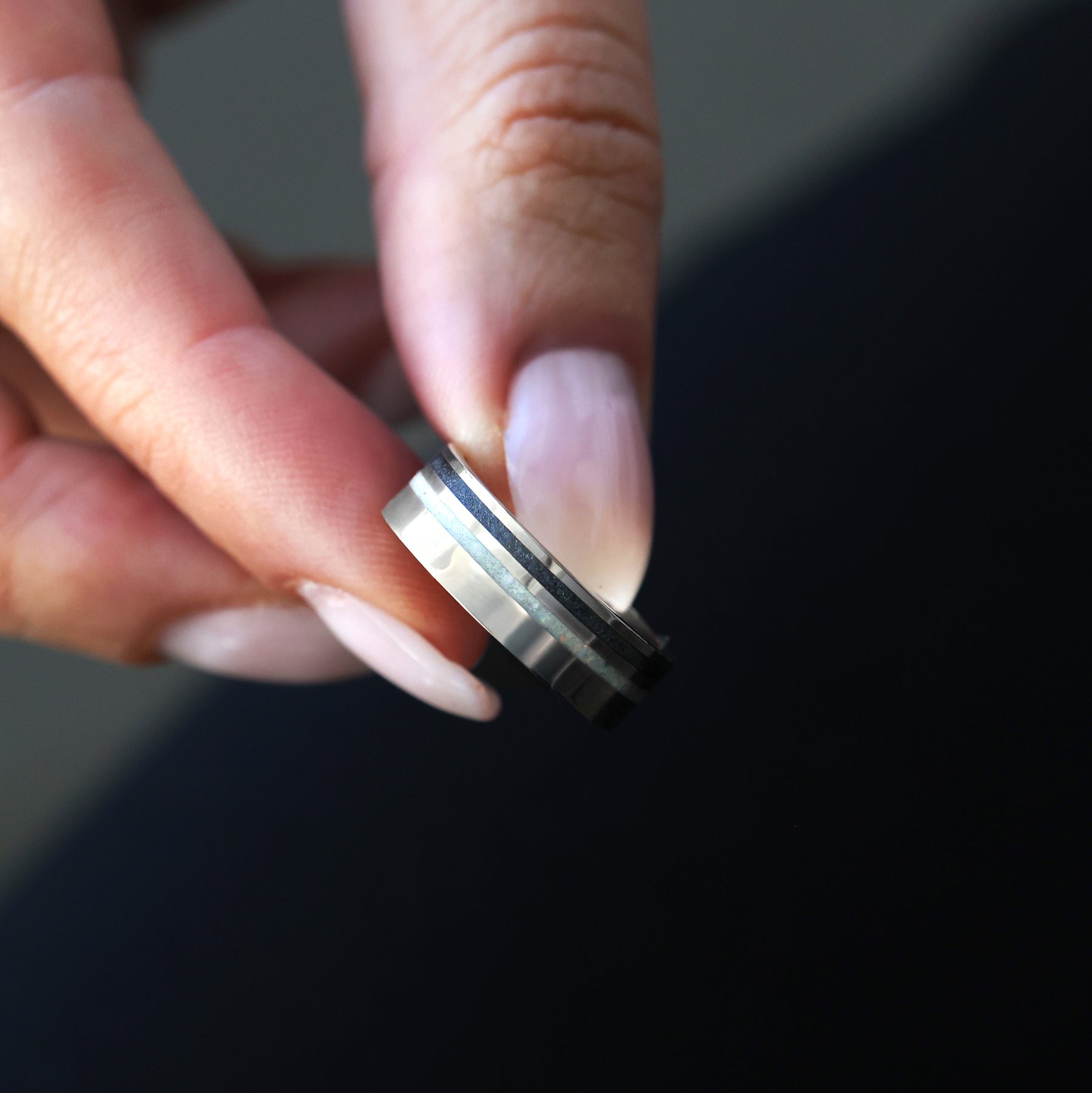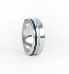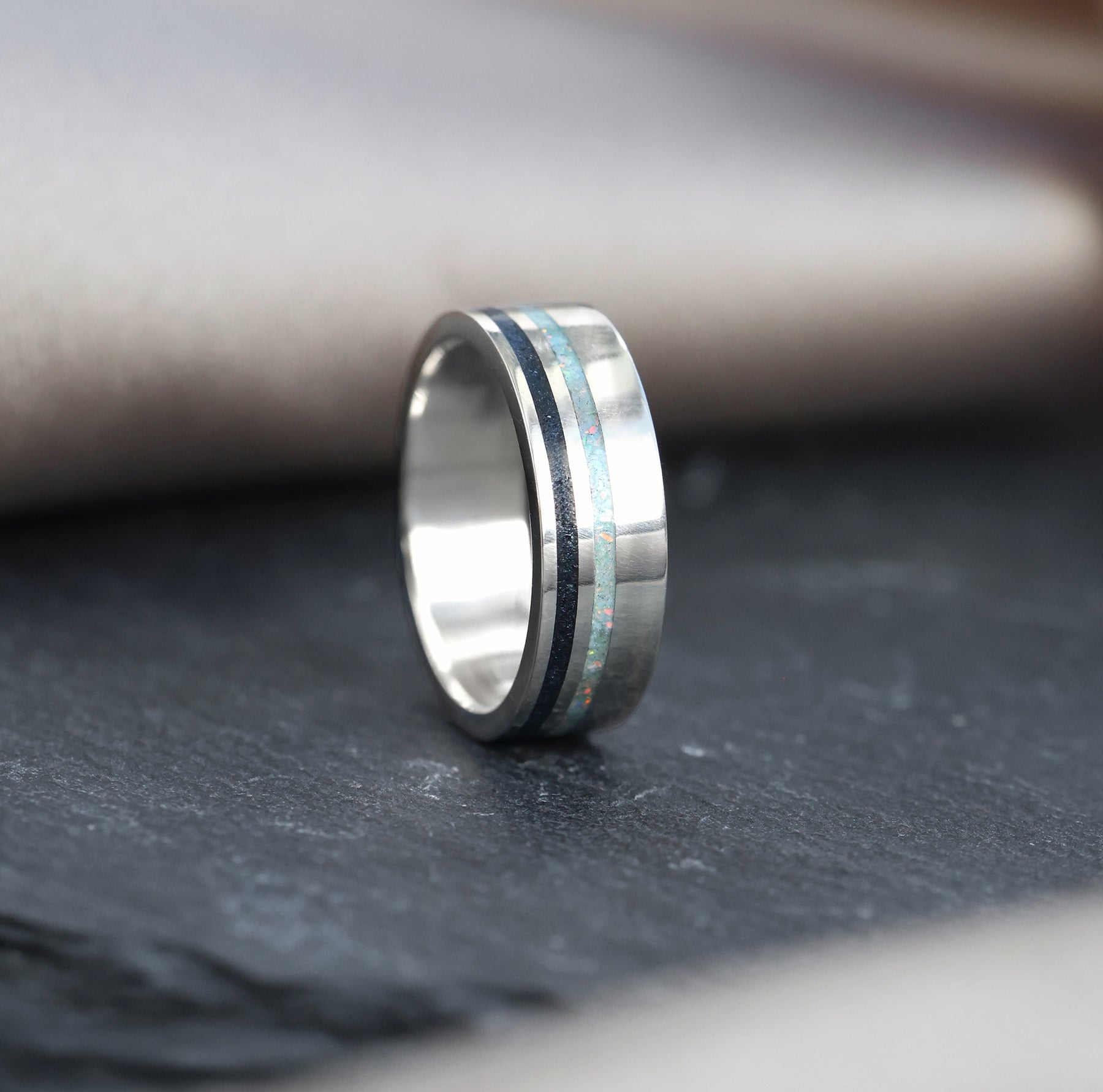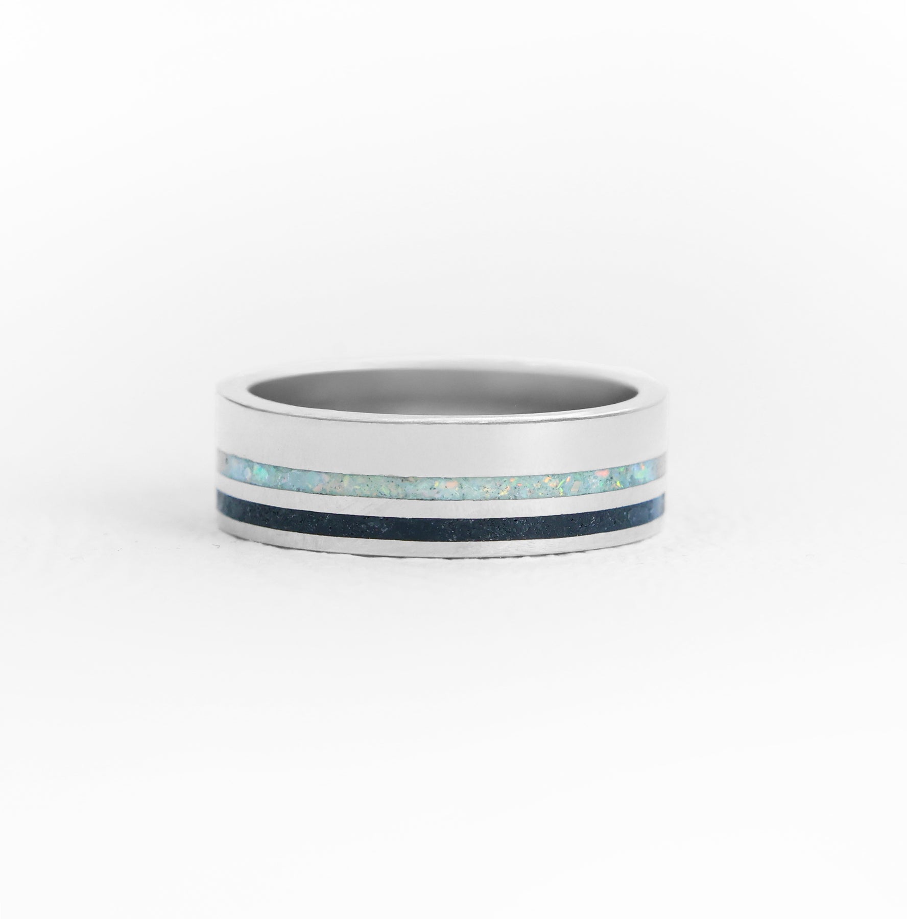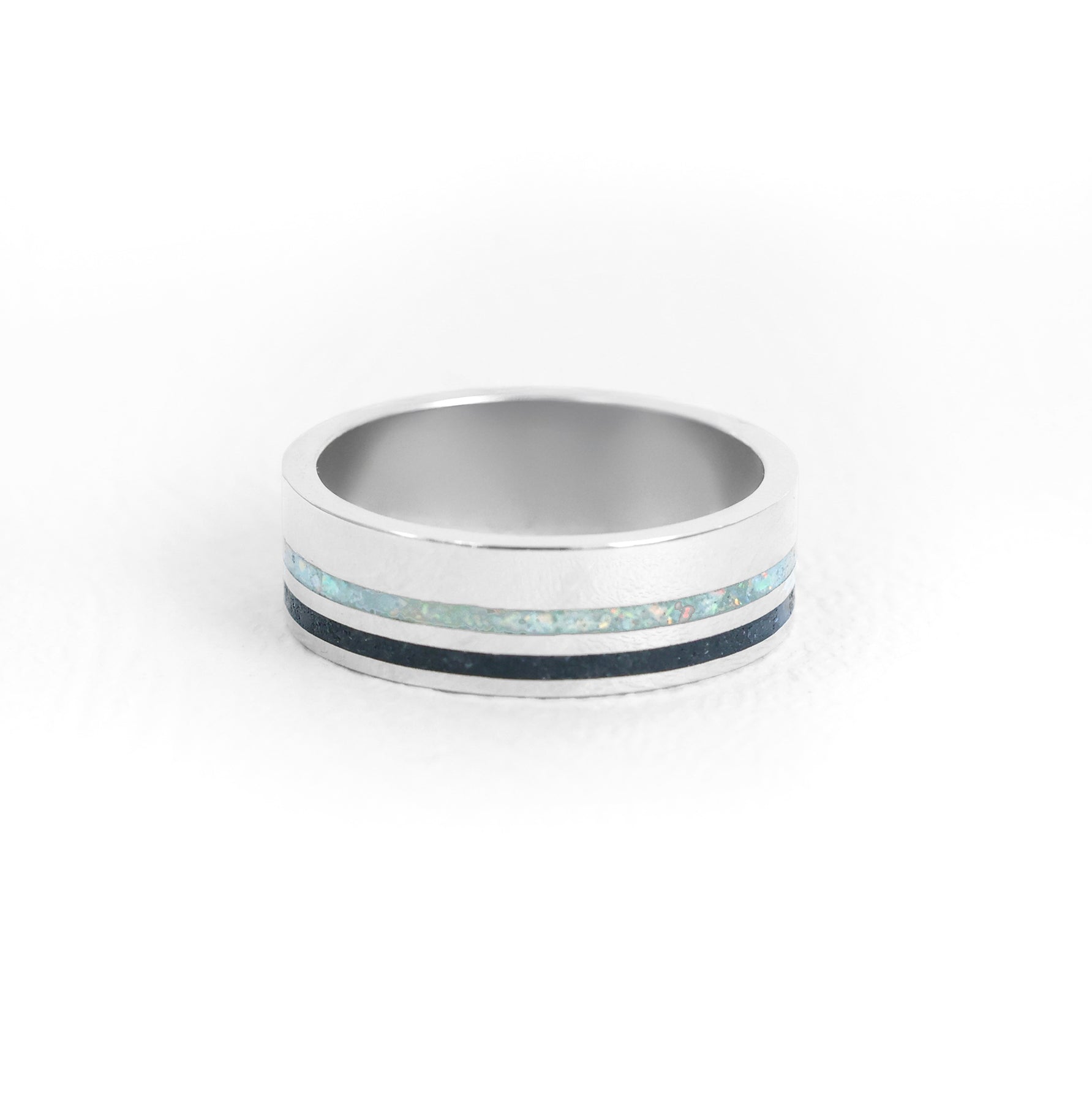 A men’s wedding band with a clean style that also works beautifully as a women’s wedding band. The black and white opal inlays add a touch of color to its simple, polished look.